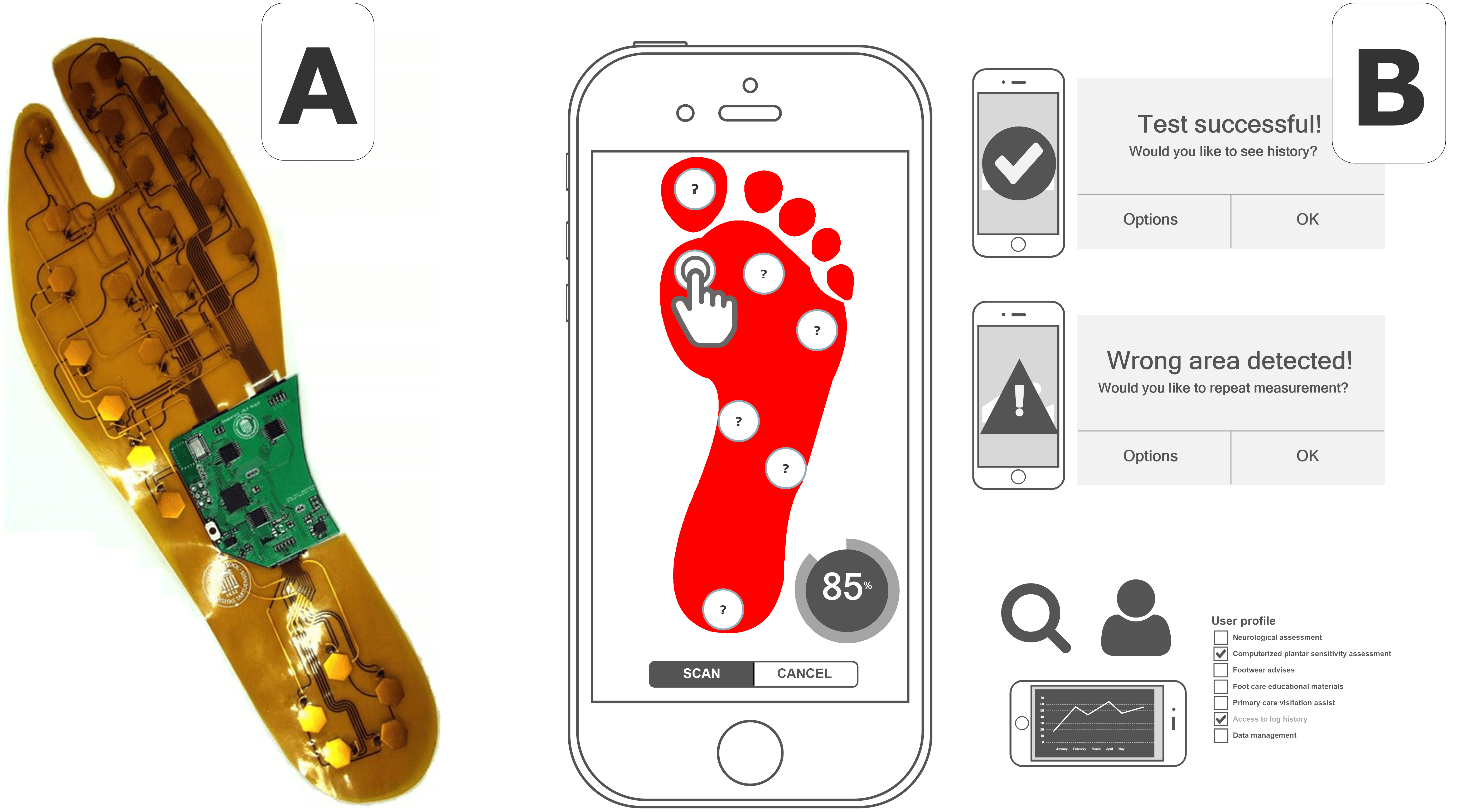 • Description: English: Figure 1. Circuitry with support electronics to accommodate 24 individual pedobarometric sensors for plantar pressure sensing insoles developed by Tamm et al. (A). Concept of App assisted Semmes-Weinstein monofilament method (B).